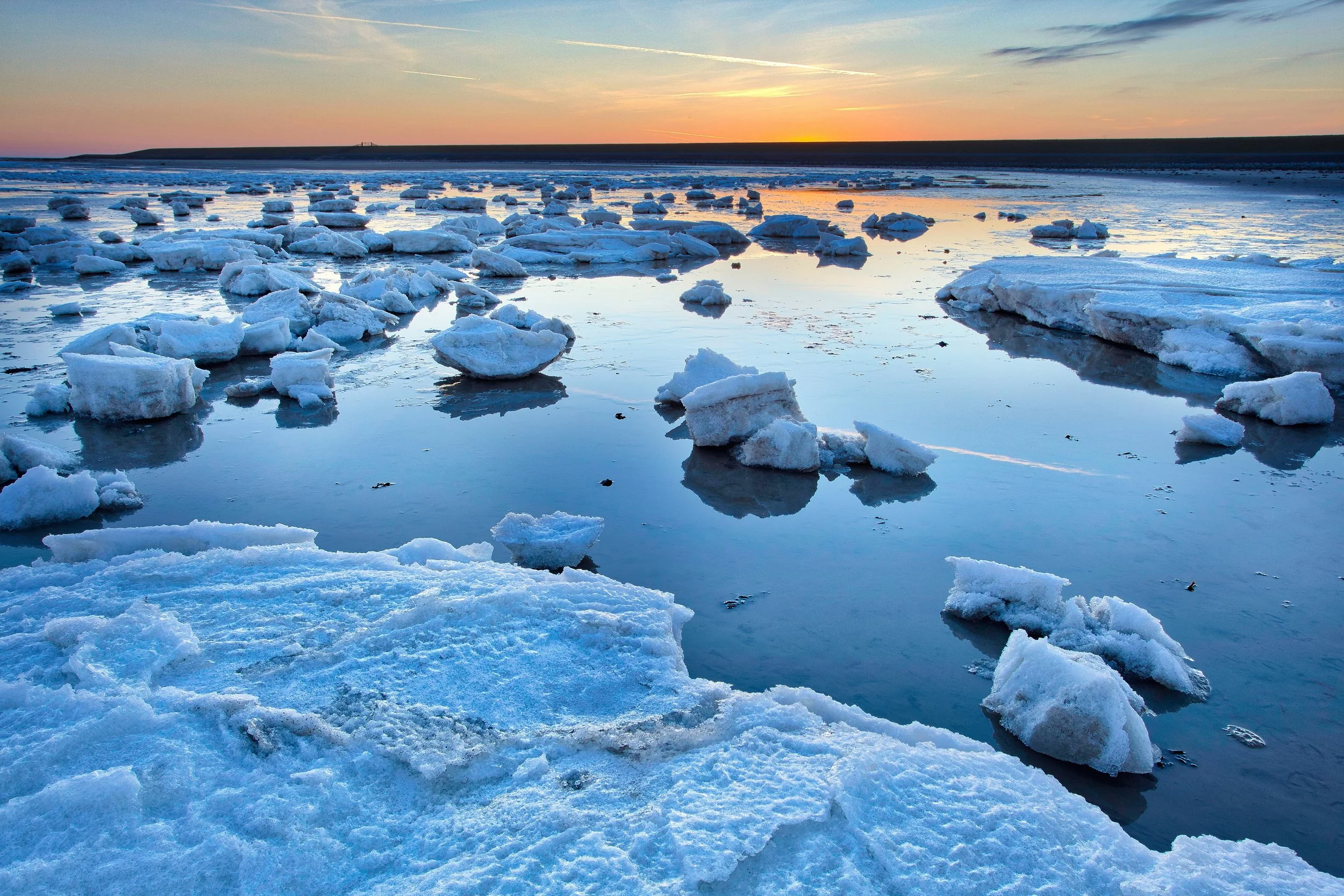 Tot aan de horizon is de Waddenzee bedekt met witte brokken ijs, die roerloos in het donkerblauwe water drijven. IJs op de Waddenzee, en dat op 19 maart!
